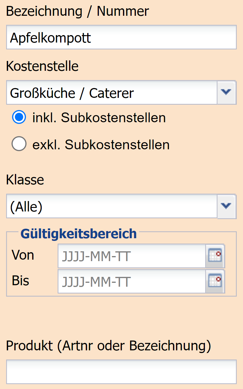 Einschränkung der Suche über diverse Parameter. In diesem Fall wurde nach der Bezeichnung "Apfel" gesucht
