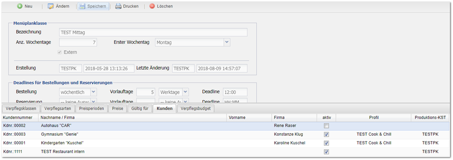 In der blau markierten Zeile sieht man, dass für den Kunden "Autohaus "CAR"" die Menüplanklasse nicht aktiv geschalten ist. Wenn der Kunde hier eine aktive Menüplanklasse hat, fällt dies unter die Verkaufslistenfunktion "Zusatzbestellungen zum Wochenmenüplan".