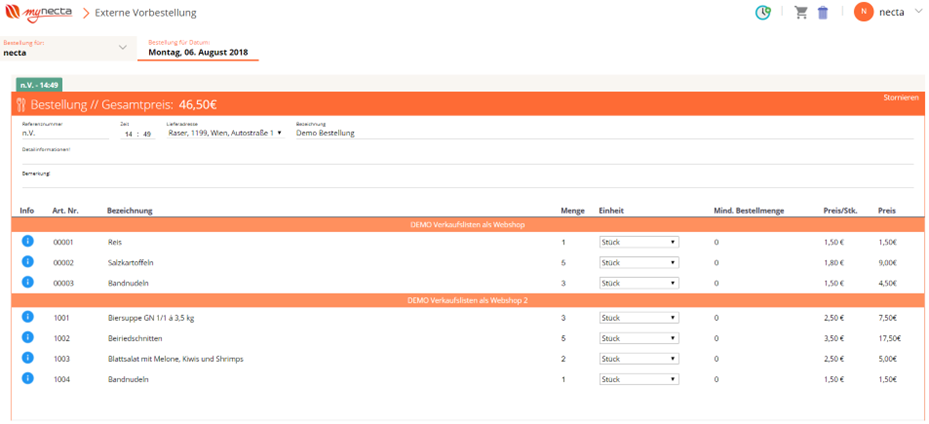 Sobald man diese Einstellungen getroffen hat wird für den Kunden über mynecta die Verkaufsliste ersichtlich und es kann darüber bestellt werden.