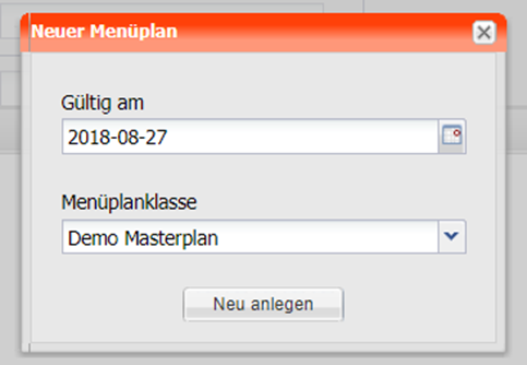 Im ersten Schritt wählt man das Gültigkeitsdatum und die Menüplanklasse für den Wochenmenüplan aus. Beim Gültigkeitsdatum wählt man üblicherweise den ersten Wochentag des Wochenmenüplans aus.