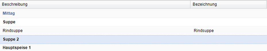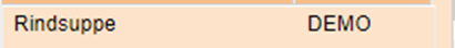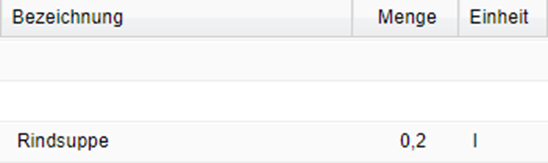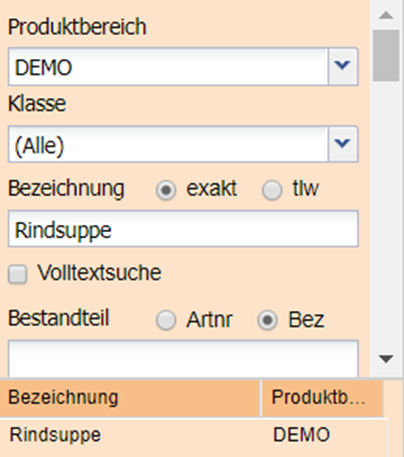An dieser Stelle können die Produkte nach diversen Suchkriterien gefiltert und gesucht werden. Hier wird nach der Bezeichnung "Rindsuppe" gesucht. Per Klick auf den Button "Suche" wird die Speise im links unteren Fenster angezeigt.